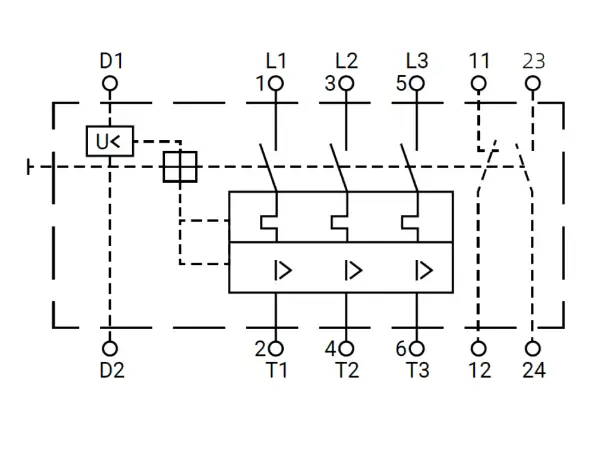 | Undervoltage release (U) | D1 – D2 (sometimes A1 – A2) | 230 V AC coil (or other rated voltage) | Coil must be energised to allow closing. Voltage dip below ~70 % UN triggers immediate trip and blocks automatic restart. |